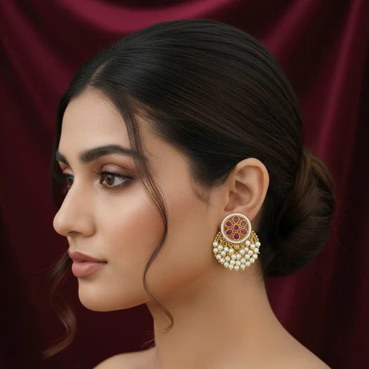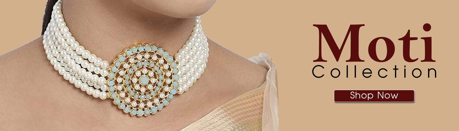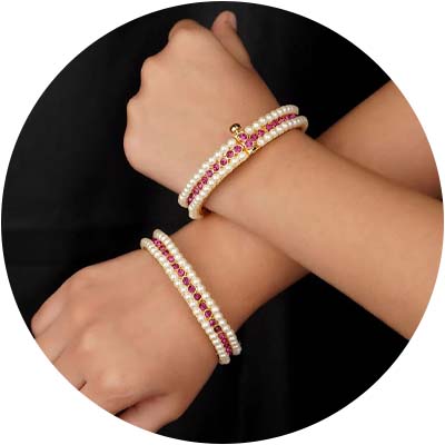 Sale price Rs. 1,350.00The Sharadmani Moti Bangles exude elegance with their intricate pearl design and delicate gold framework. Embellished with tiny red stones at the center, these bangles offer a perfect blend of traditional charm and royal sophistication. Ideal for festivals, weddings, and special occasions, they enhance any ethnic attire, making them a must-have for those who appreciate graceful and timeless jewelry pieces. -