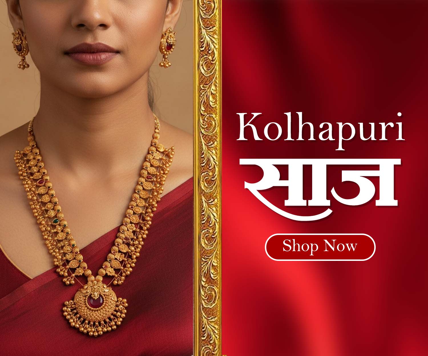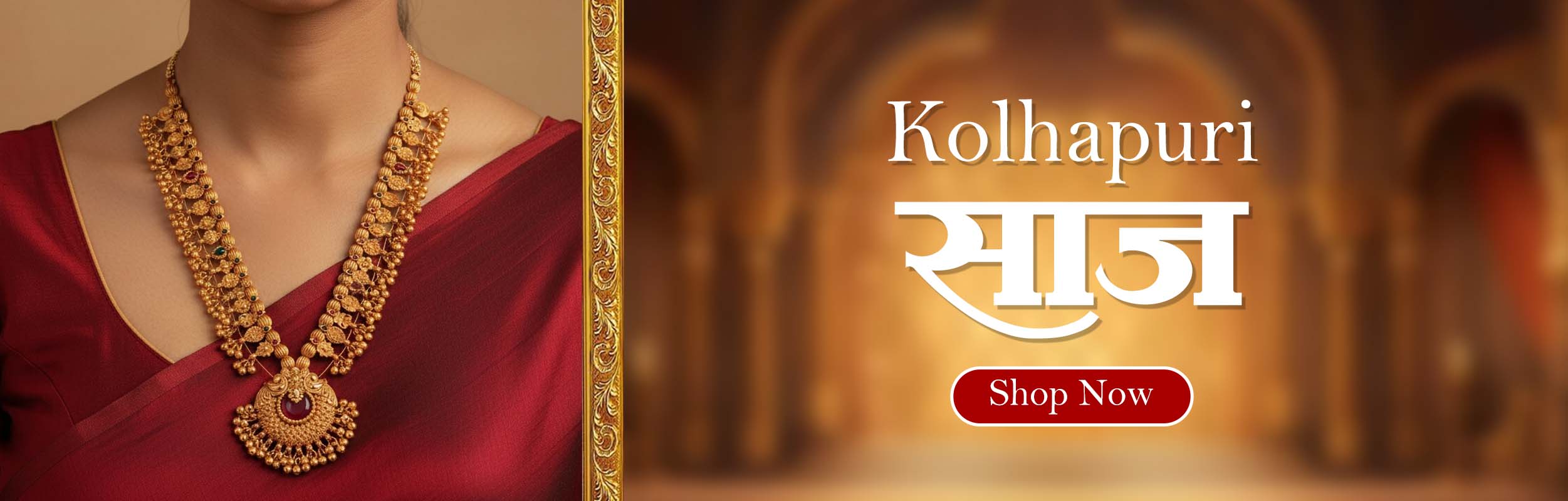 Sale price Rs. 1,440.00The RajyaLakshami Kolhapuri Antique Thushi is a regal masterpiece, exuding heritage and tradition. Crafted with intricate gold detailing, this choker-style necklace showcases fine craftsmanship inspired by royal aesthetics. Adorned with delicate embellishments and a striking central motif, it perfectly complements traditional Maharashtrian attire. The matching earrings add to its grandeur, making it an ideal choice for weddings and festive occasions. A timeless piece that enhances... -
