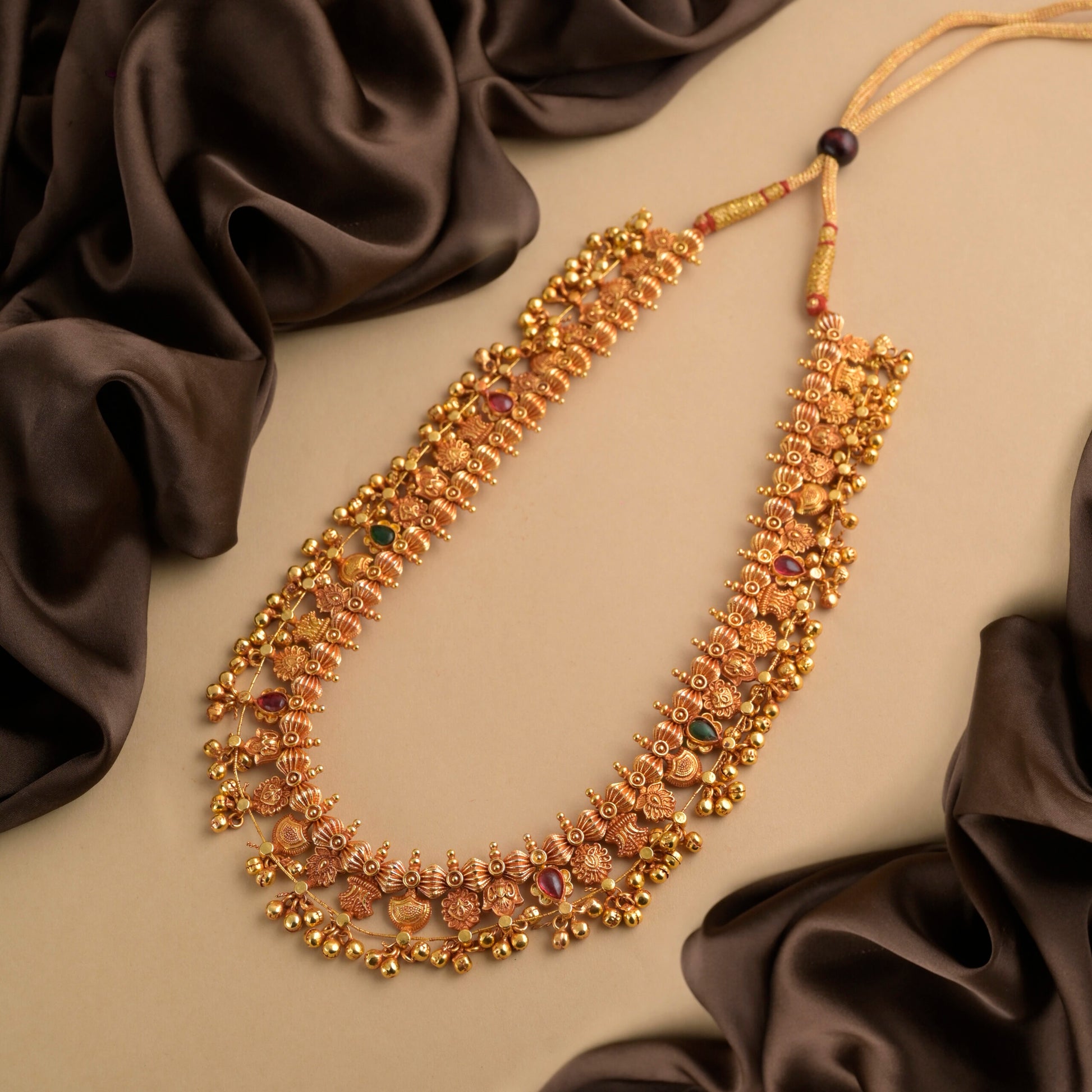 The Arohi Varnika Saaj is a stunning piece of traditional Maharashtrian jewelry that exudes timeless elegance. This intricate necklace features delicate gold-toned motifs, embellished with small ghungroos (bells) and vibrant gemstones, adding a regal charm. The handcrafted detailing and antique finish make it a perfect choice for festive occasions, weddings, and cultural celebrations, complementing traditional sarees and ethnic wear beautifully.
