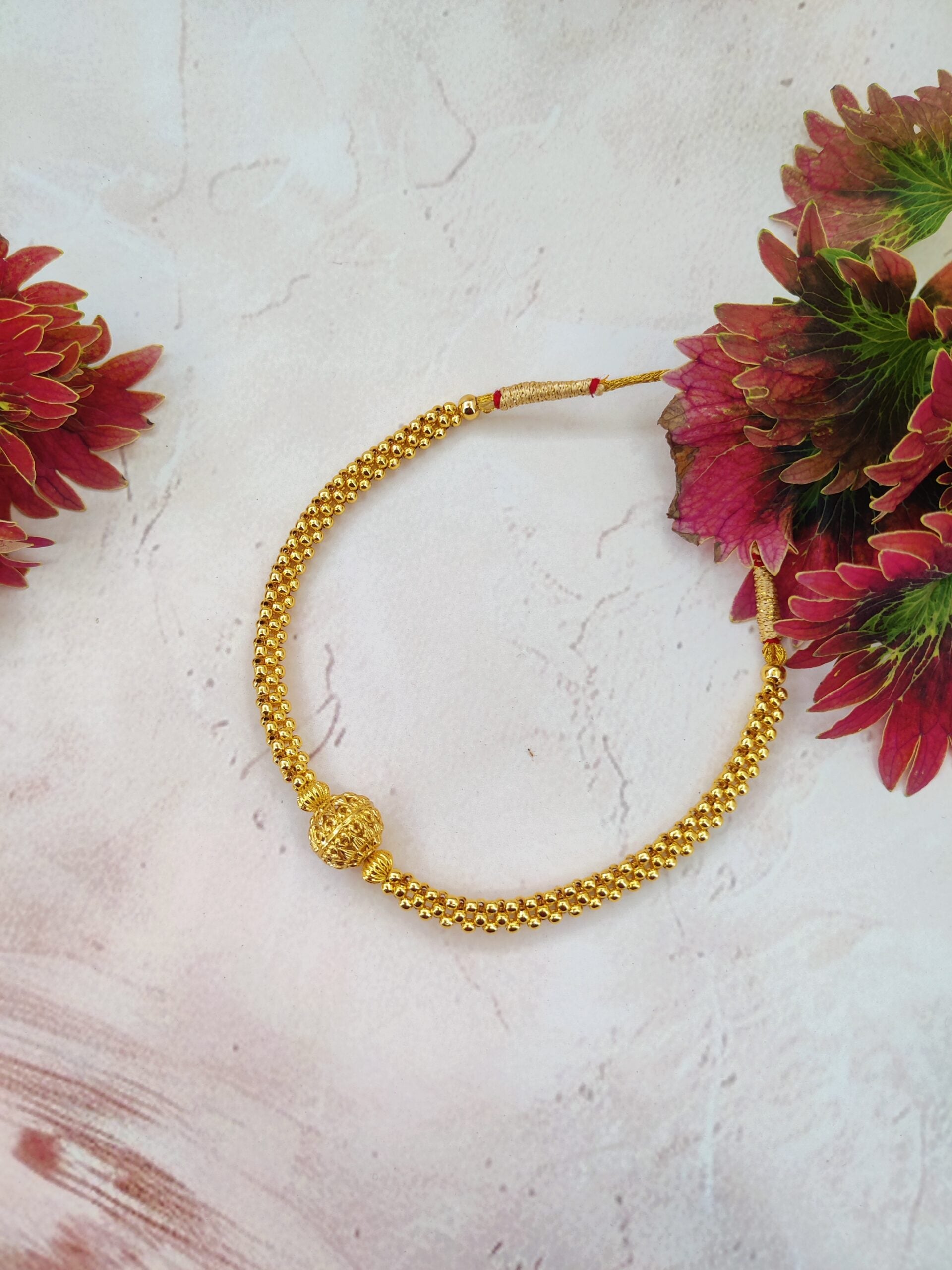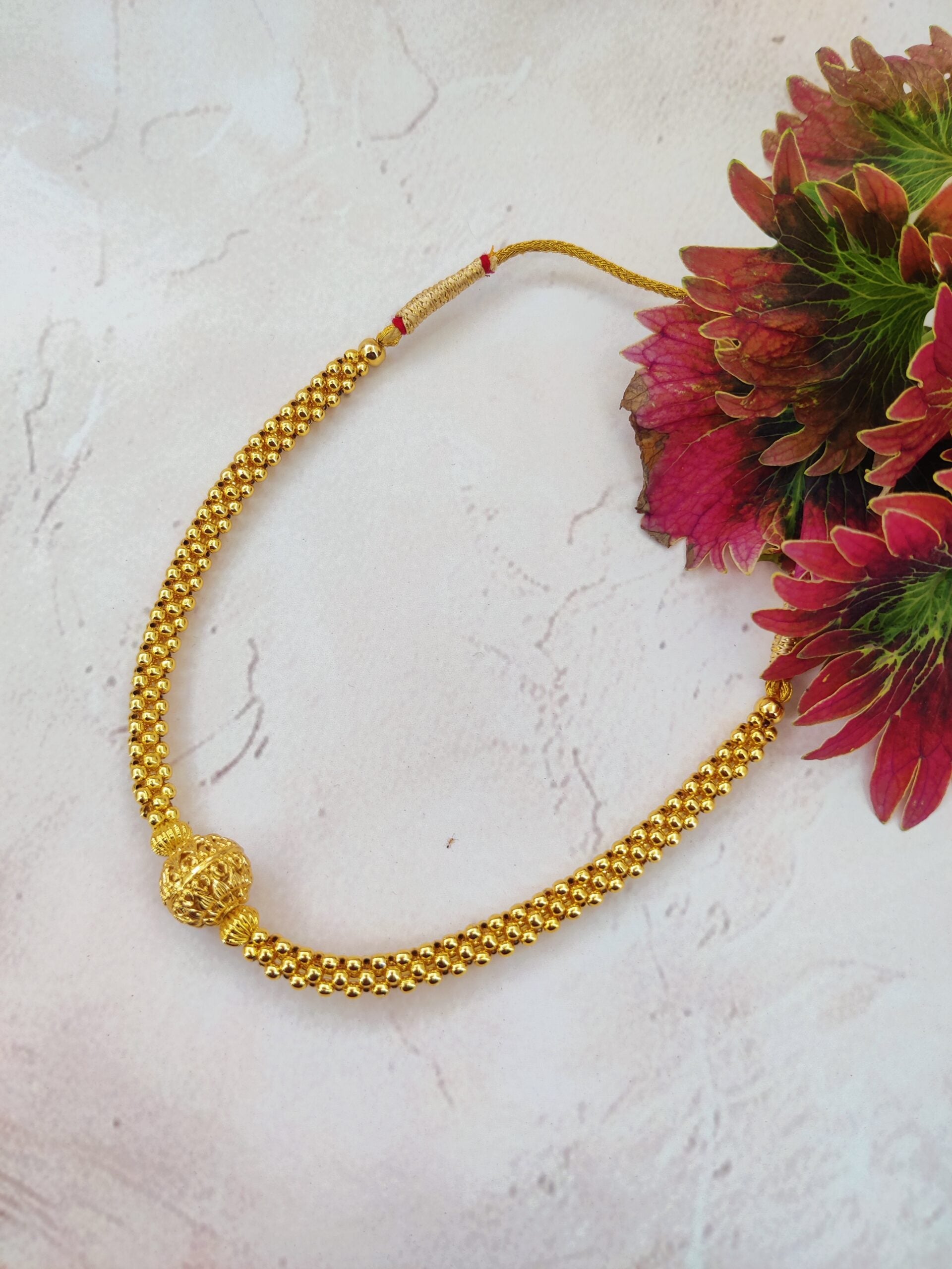 Kolhapuri Damru Mani Thushi A distinctive Kolhapuri Thushi crafted with traditional damru mani beadwork and intricate detailing. Its elegant close-neck design adds a bold yet graceful touch of Maharashtrian heritage, perfect for festive and cultural occasions
