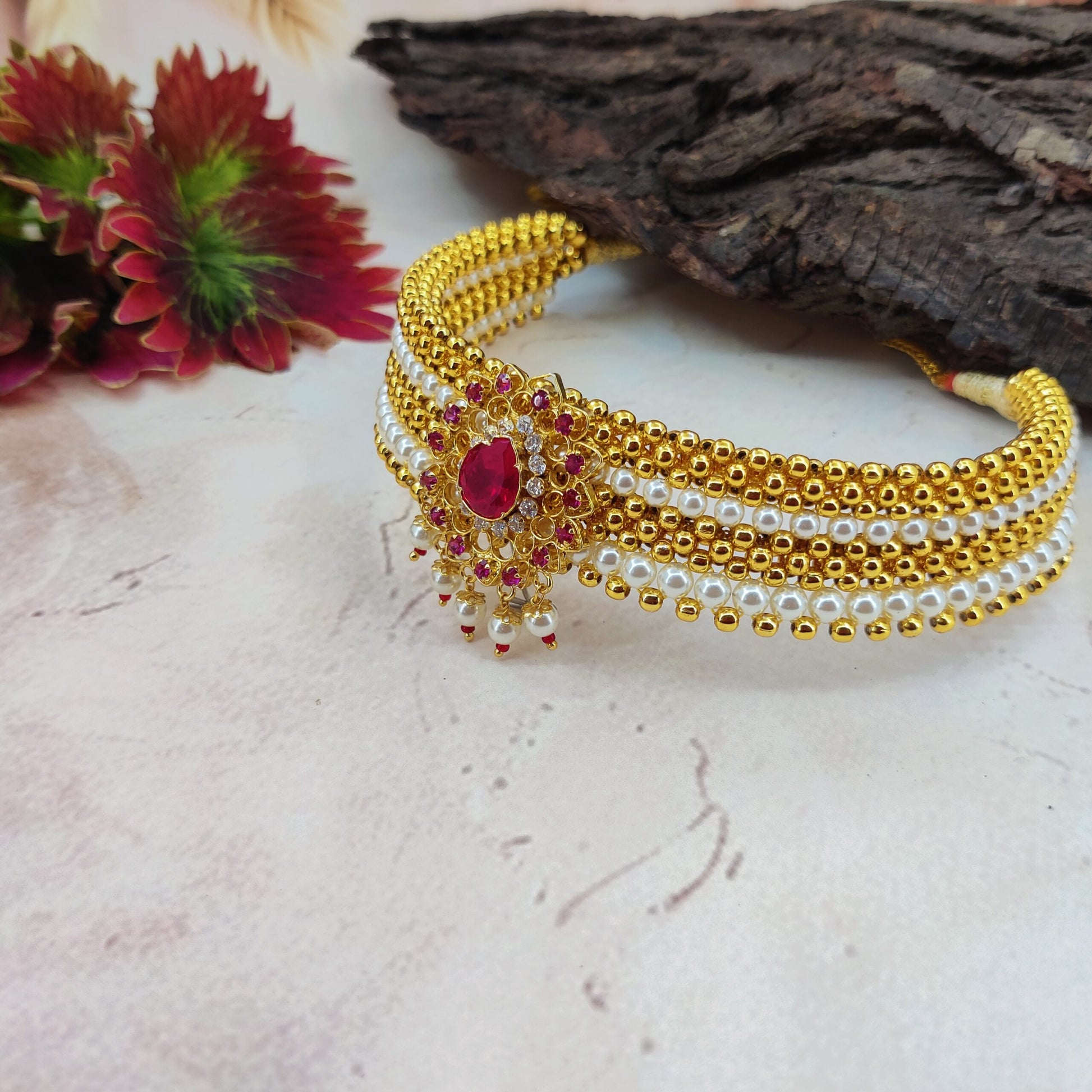 Kolhapuri Moti Thushi A classic Kolhapuri Thushi crafted with lustrous moti beads and traditional weaving. Its elegant close-neck design adds timeless grace and authentic Maharashtrian charm to festive and cultural occasions.