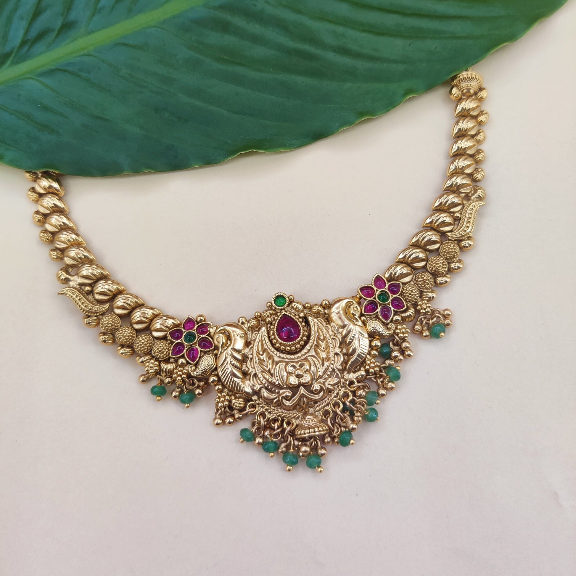 Mayurkali Antique Necklace A beautifully crafted antique-style necklace inspired by peacock motifs, featuring intricate detailing and traditional craftsmanship. Its elegant design adds a vibrant and regal charm to festive and ethnic attire.