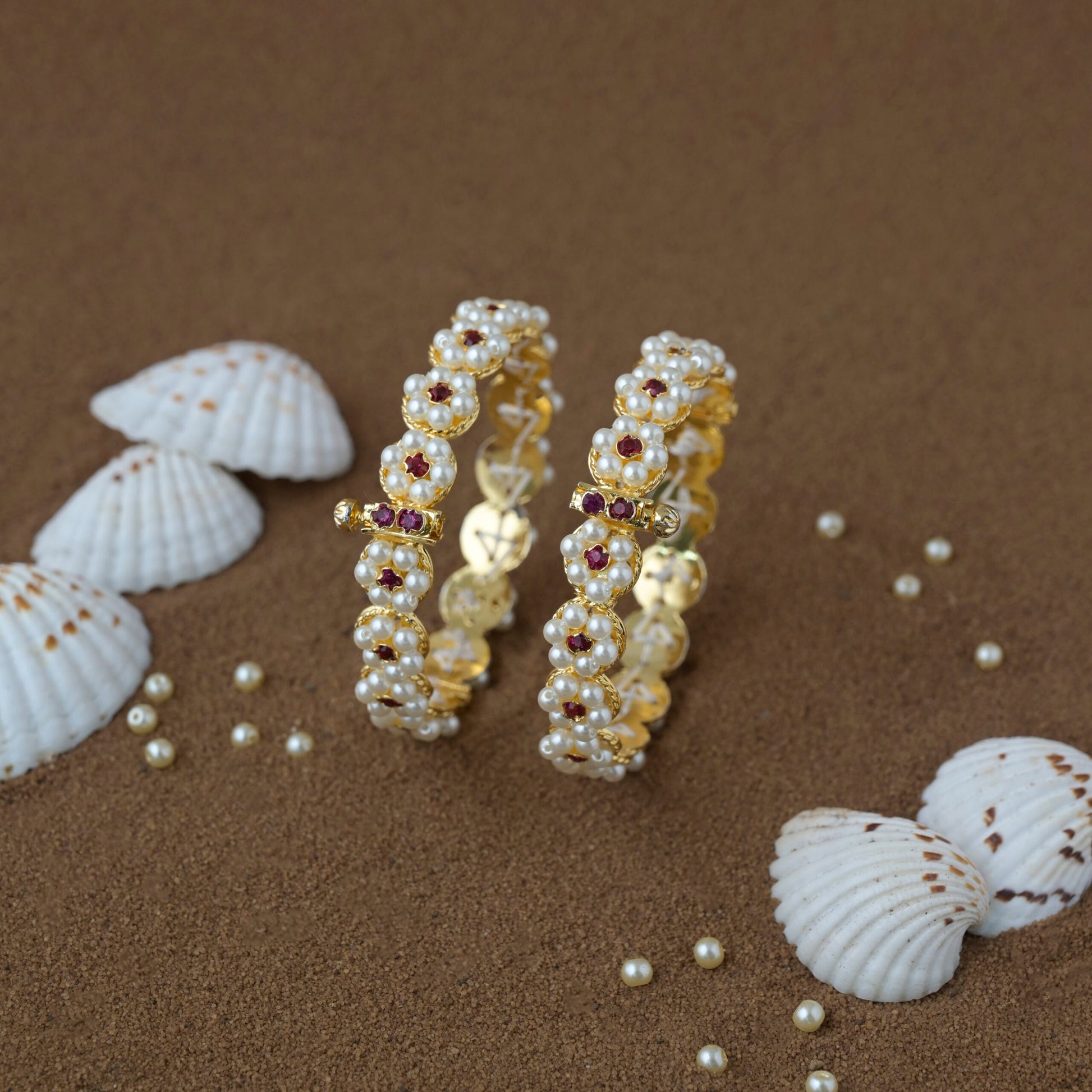 Introducing the exquisite Moti Gulzar Bangles, a stunning blend of intricate craftsmanship and timeless elegance. This set of 1 features beautifully designed gold-toned bangles, adorned with delicately arranged pearls in a floral pattern, accented with sparkling ruby-colored stones for a regal touch. The intricate detailing and fine artistry make these bangles a perfect choice for weddings, festive occasions, and traditional celebrations. Lightweight yet durable, they offer a comfortable fit while adding a graceful charm to any ethnic ensemble. Elevate your jewelry collection with the unmatched beauty of Moti Gulzar Bangles.