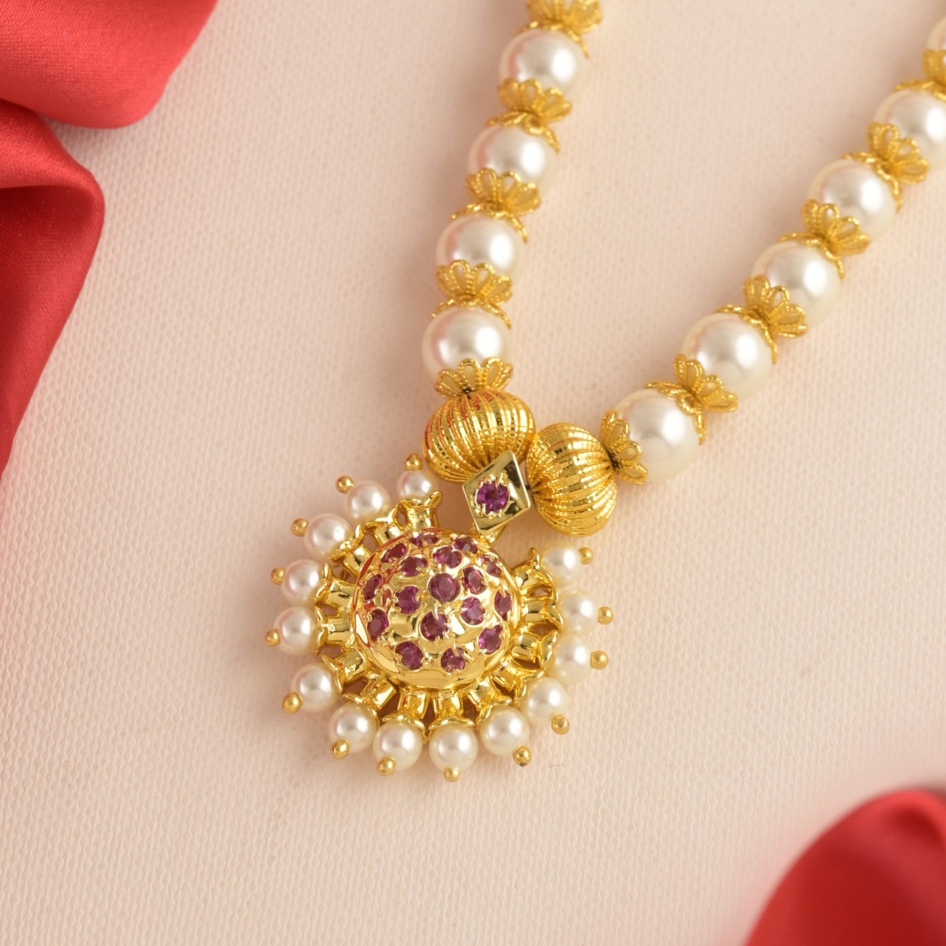 The Rajmudrika Short Necklace is a graceful blend of tradition and elegance. Featuring a string of radiant pearls, it highlights a beautifully crafted gold pendant with intricate detailing and embedded stones. The delicate pearl embellishments add a touch of royalty, making it perfect for festive and bridal occasions. This timeless piece complements ethnic wear, enhancing your regal charm. A must-have for lovers of classic jewelry.