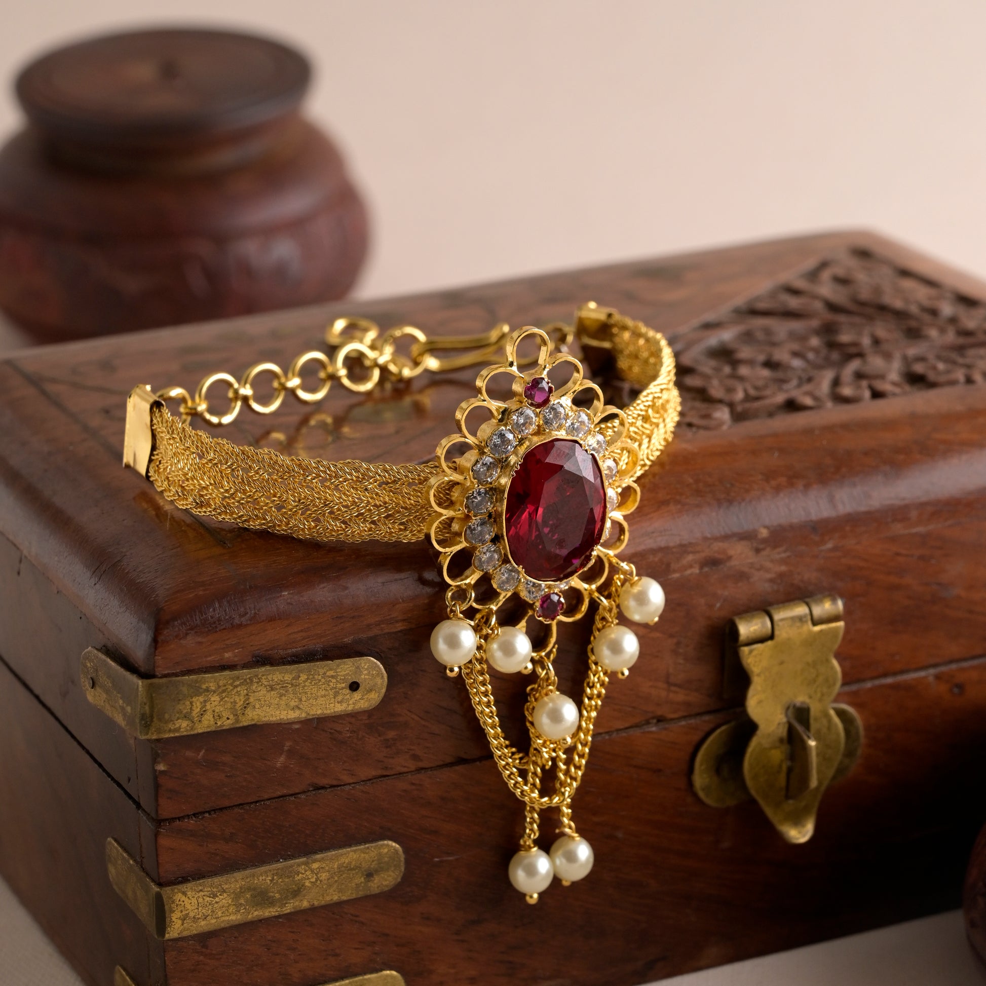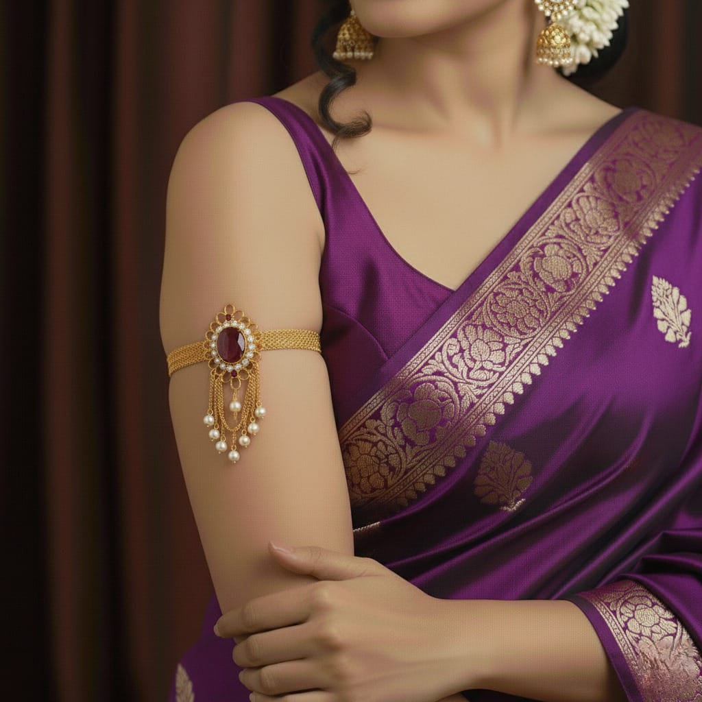 Description: (SILVER) Channel Your Inner Diva with Nayika Ratna Bajubandh Bold. Beautiful. Unapologetically you. The Nayika Ratna Bajubandh is the statement piece your ethnic wardrobe been waiting for! Adorned with dazzling gemstones (ratna) and crafted to perfection, this bajubandh brings major royal-core vibes with a modern twist. Rock it with your bridal lehenga, saree, or fusion fits and own the spotlight like the nayika you are! Because some jewels don’t just accessorize—they tell a story.