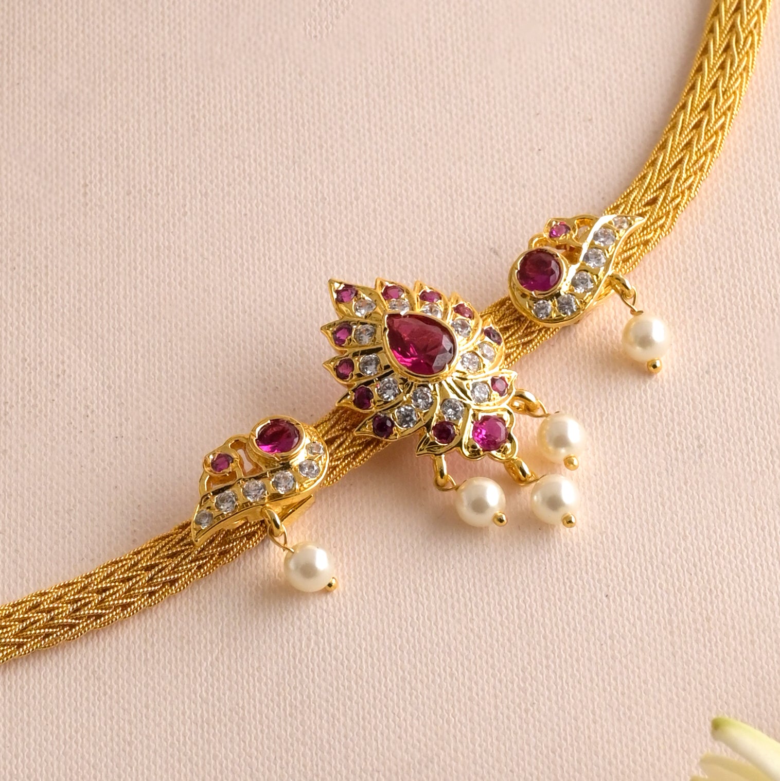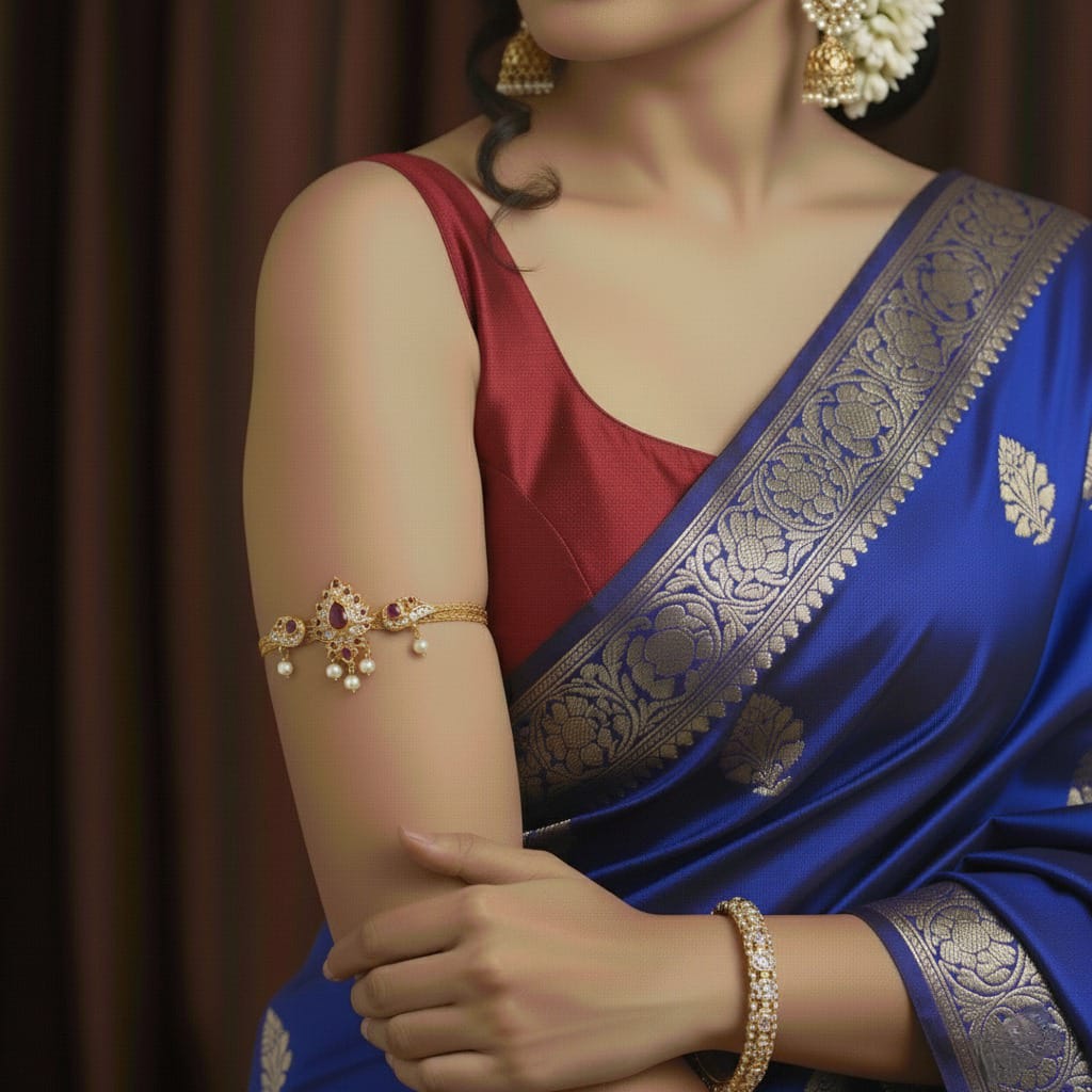 The Parna Phool Bajubandh is a stunning blend of nature-inspired artistry and modern sophistication. Featuring intricate leaf (Parna) and flower (Phool) motifs, this elegant armlet is beautifully adorned with pink stones that add a pop of vibrant charm. The delicate arm strip ensures a comfortable fit while enhancing its graceful appeal. Perfect for weddings, festive occasions, and traditional celebrations, this bajubandh pairs effortlessly with sarees, lehengas, and Indo-western outfits, adding a refreshing touch of nature’s beauty to your look.