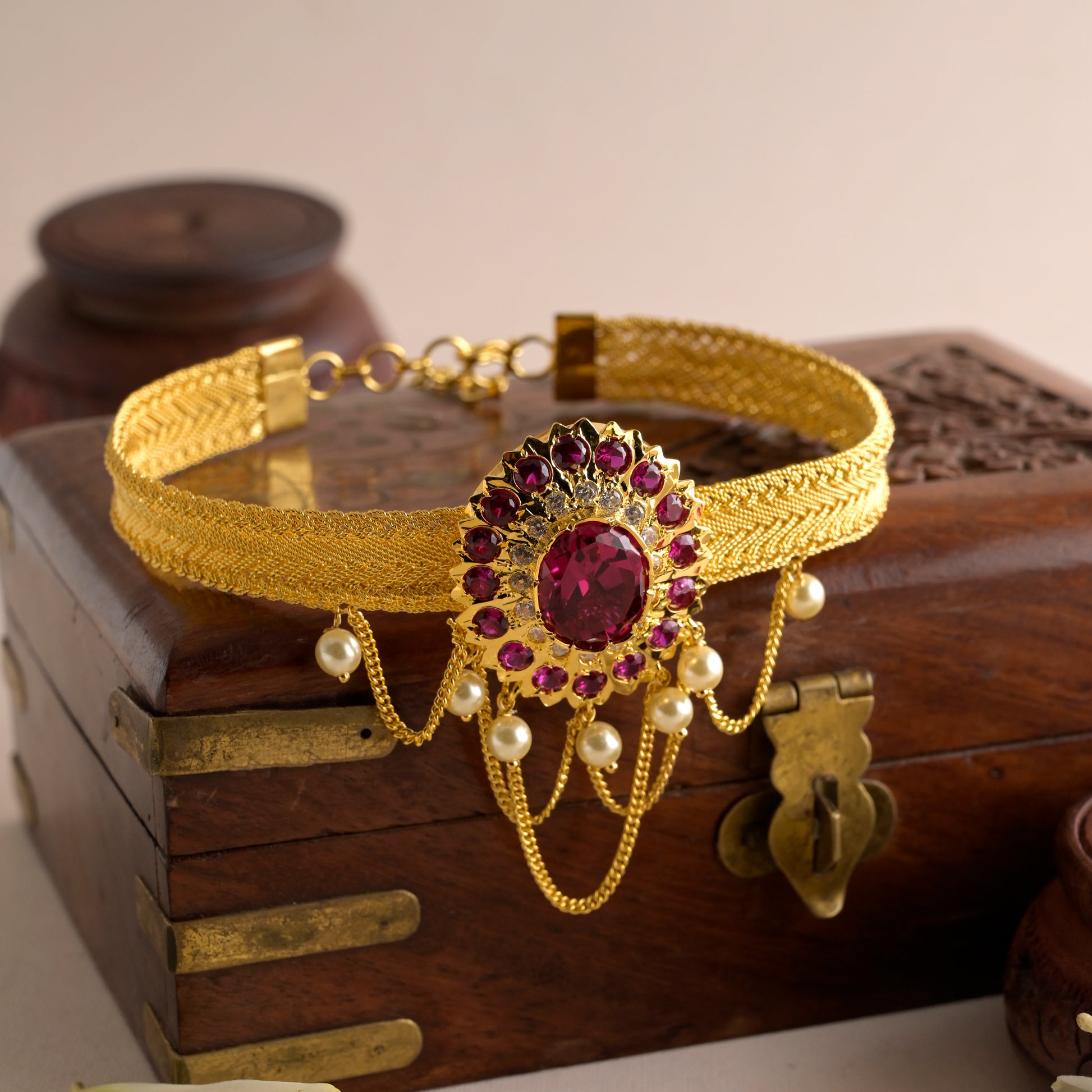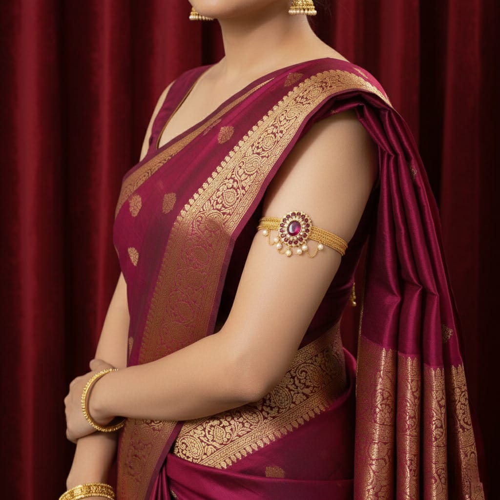 Make a bold style statement with the Raj Mohar Bajubandh, featuring exquisite pink stones and elegant chain detailing. Inspired by the grandeur of royal seals (Mohar), this bajubandh blends tradition with a contemporary twist, perfect for adding a regal touch to your festive or bridal look. The delicate chains drape beautifully on the arm, while the vibrant pink stones add a playful yet sophisticated vibe. Pair it with lehengas, sarees, or fusion wear to turn heads at weddings, engagements, and festive celebrations.