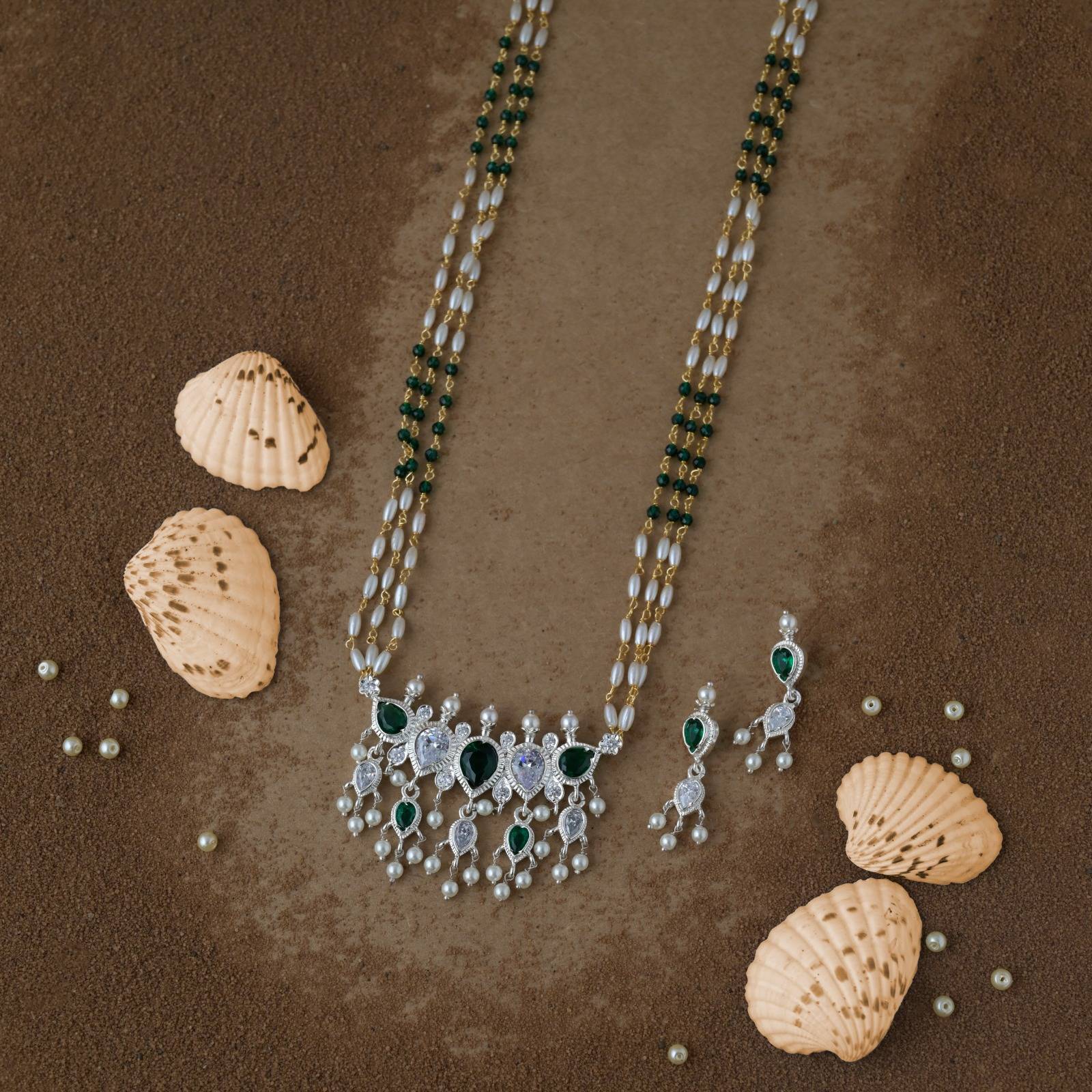 The Ratna Malini Rice Pearl Tanmani Set is a stunning blend of elegance and tradition, perfect for those who adore timeless jewelry. This exquisite set features delicate strands of rice pearls intertwined with vibrant green beads, creating a captivating contrast. The pendant showcases a graceful arrangement of sparkling AD (American Diamond) stones and rich emerald-green accents, exuding sophistication and charm. Designed for weddings, festive occasions, and cultural events, this Set of 1 includes a matching pair of intricately designed earrings, completing the look with regal finesse.