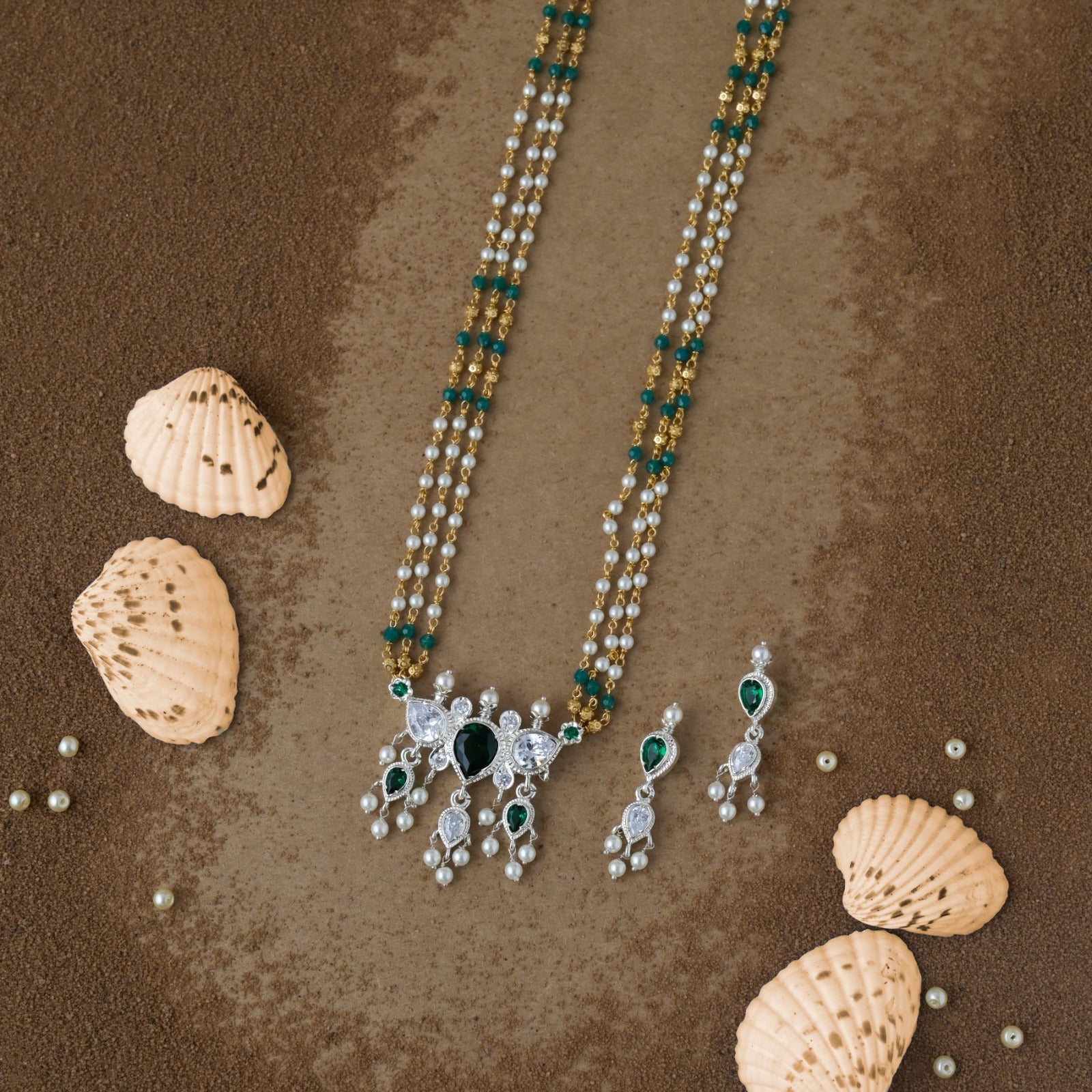The Sitaara Harit Rice Pearl Tanmani Set is a stunning blend of elegance and tradition. This beautifully handcrafted piece features multiple strands of lustrous rice pearls interwoven with delicate green beads, symbolizing prosperity and grace. The intricately designed pendant is adorned with deep green gemstones surrounded by sparkling AD (American Diamond) embellishments, enhancing its regal appeal. Paired with matching earrings, this Set of 1 is perfect for festive occasions, weddings, and cultural celebrations, adding a touch of sophistication to any ethnic ensemble.
