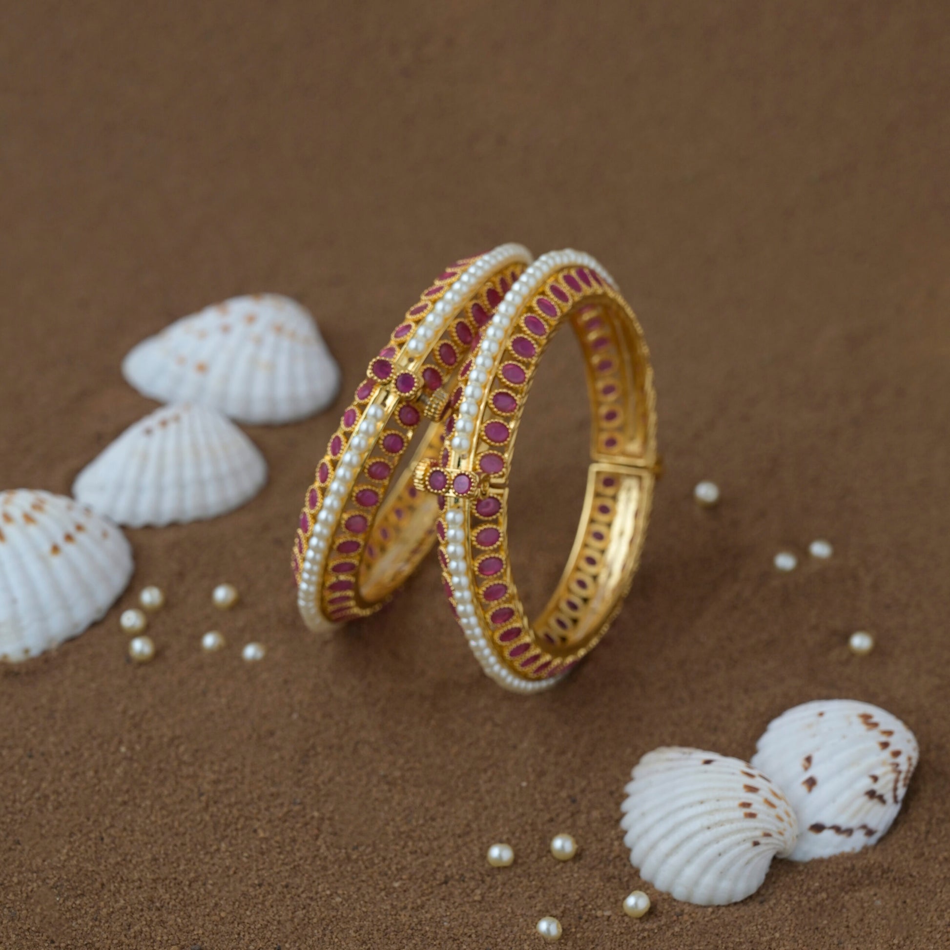 • The Sindhumani Moti Bangles showcase an exquisite gold and pearl lattice design adorned with delicate red stone embellishments. Their elegant floral-inspired pattern makes them perfect for traditional occasions, weddings, and festive celebrations. Lightweight yet regal, these bangles beautifully complement ethnic attire, adding a touch of grace and sophistication to your look.