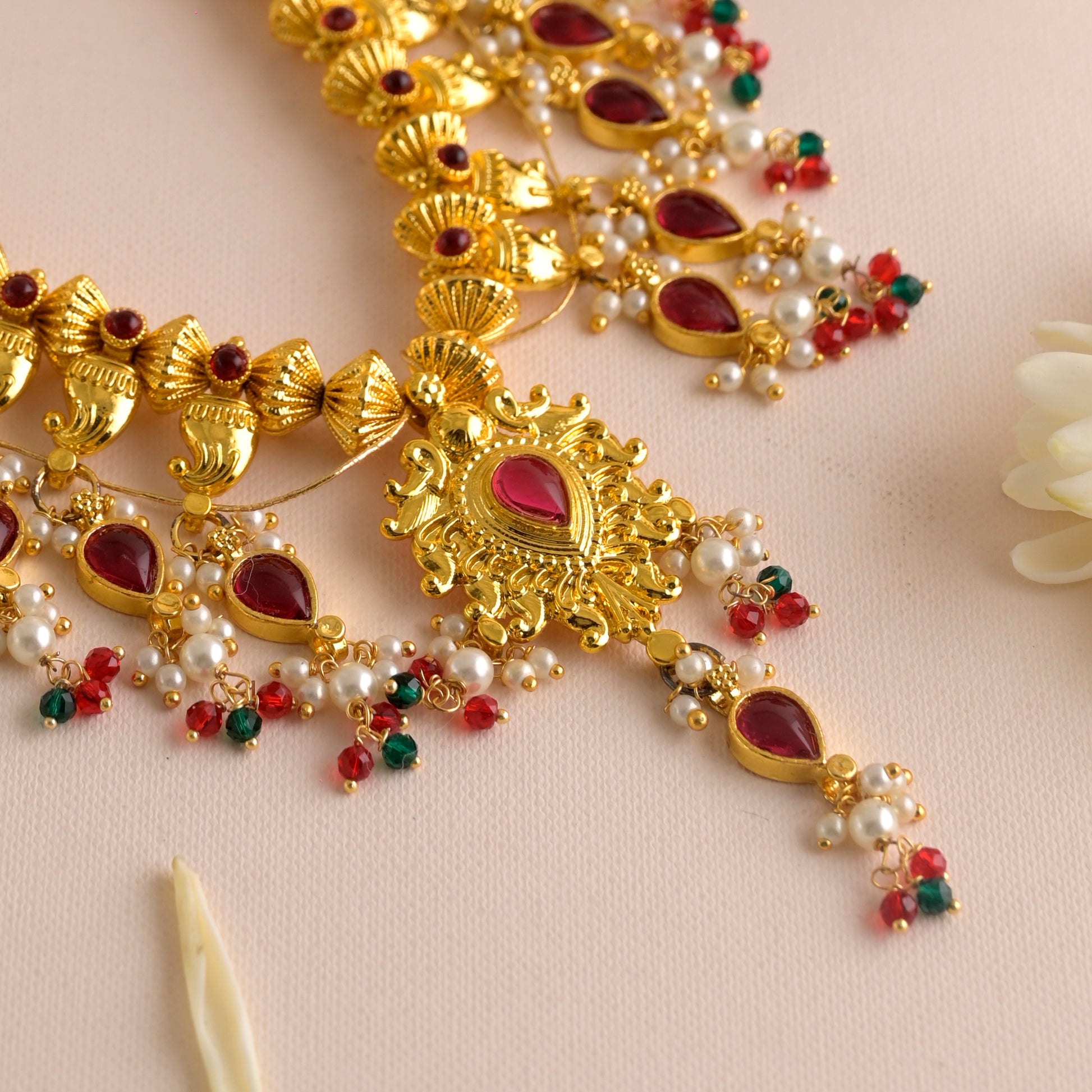 The Swarna Rasa Saaj is a stunning traditional Maharashtrian necklace featuring intricate gold craftsmanship, teardrop-shaped red gemstones, and delicate pearl embellishments. The cascading design, adorned with small red and green beads, enhances its elegance and grandeur. This piece is ideal for weddings, festive occasions, and cultural celebrations, complementing rich traditional attire such as Paithani and Nauvari sarees. The unique detailing and symmetrical arrangement make it a timeless and regal addition to any jewelry collection.