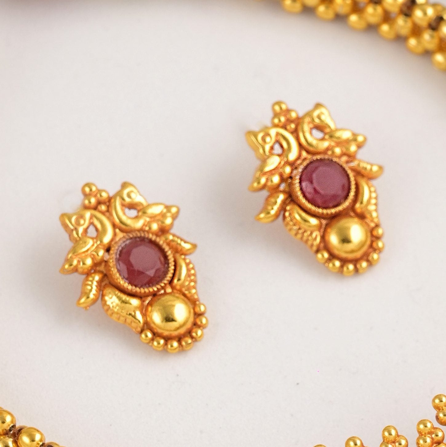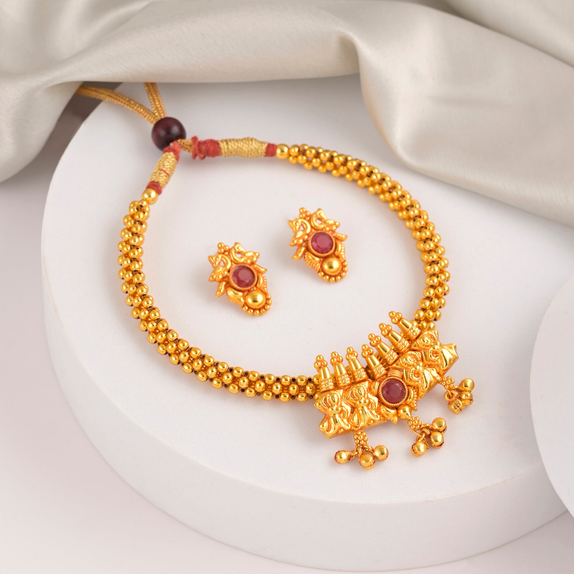 The TamraShree Kolhapuri Antique Thushi is a traditional Maharashtrian choker with intricate gold beadwork and a temple-inspired pendant. It features red stone embellishments, symbolizing prosperity and heritage. Handcrafted with an antique finish, it pairs beautifully with ethnic wear. The matching earrings enhance its elegance, making it ideal for weddings and festive occasions. This Thushi reflects the rich legacy of Kolhapuri jewelry, adding a regal touch to any look.