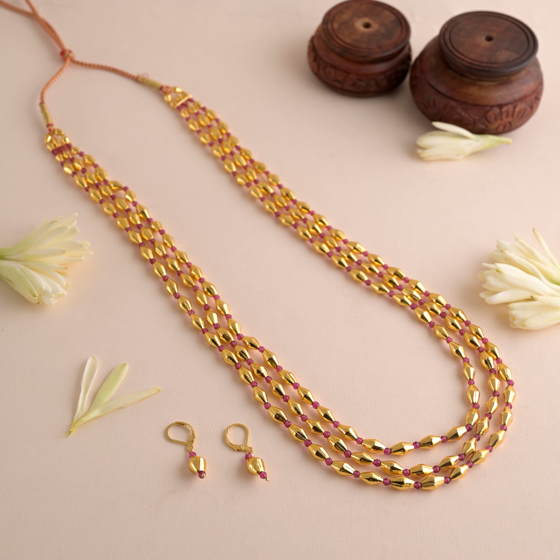 The Trilaya Kolhapuri Boremala is a beautifully handcrafted three-layered traditional necklace, adorned with intricate gold-toned beads and red accents. It represents the rich cultural heritage of Kolhapur and is a perfect blend of elegance and tradition. This piece is ideal for festive occasions, weddings, and ethnic wear, bringing a regal touch to any attire. The set includes matching earrings, completing the graceful and timeless look.