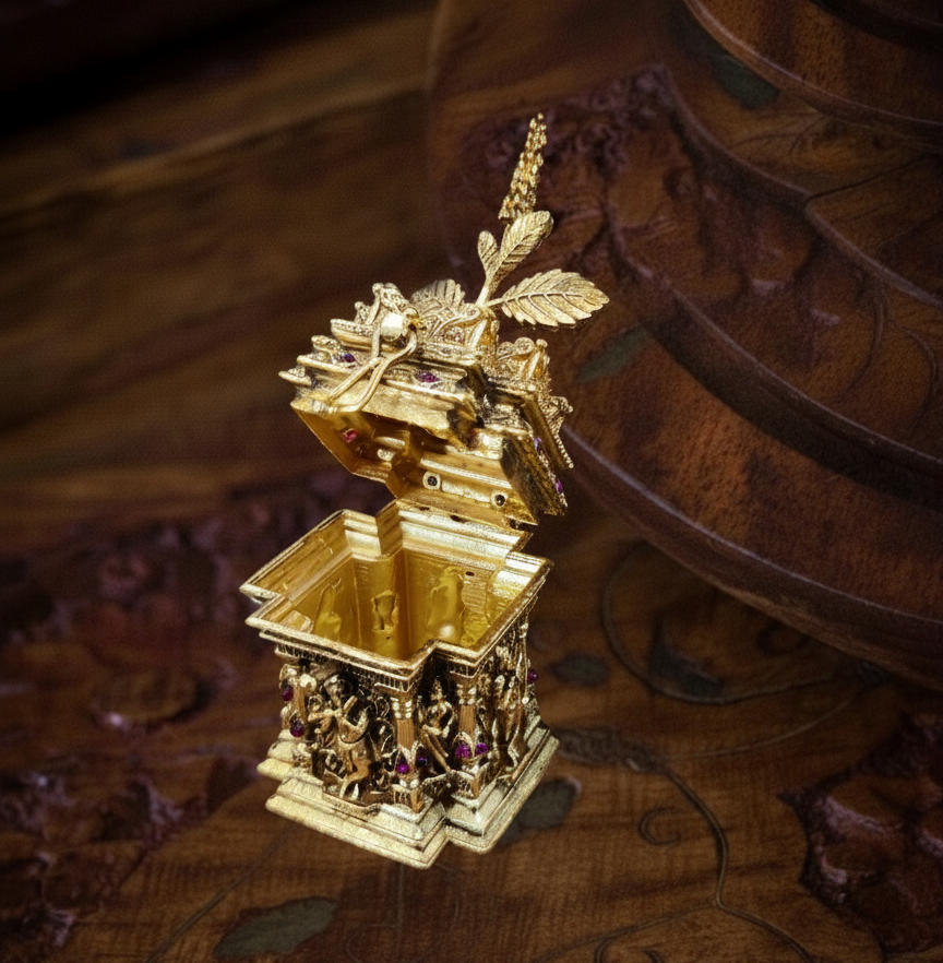 Tulsi Radhakrishna Karande: Uniting sacred motifs of Tulsi and Radha-Krishna. This ornate container brings divine blessings and rich spiritual artistry to your puja.