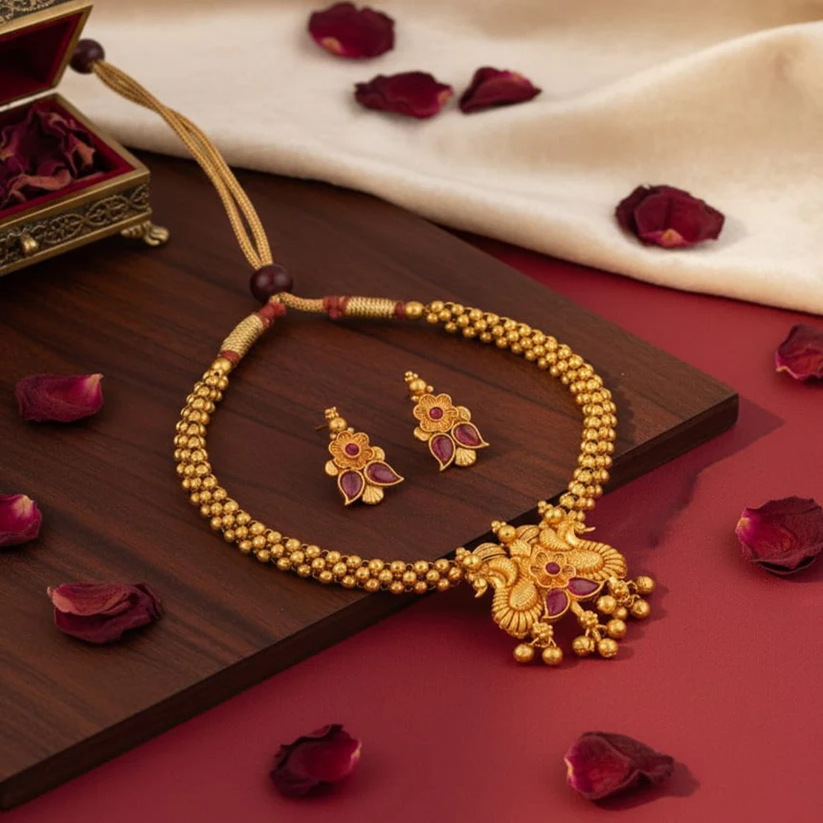 The Nava Varnika Kolhapuri Antique Thushi is a timeless piece of traditional Maharashtrian jewelry. Crafted with intricate gold beads, it features a beautifully designed pendant with vibrant pink stones, enhancing its regal charm. The delicate matching earrings add to its elegance, making it perfect for festive and cultural occasions. Its adjustable dori ensures a comfortable fit, reflecting both heritage and craftsmanship. A must-have for those who love authentic Kolhapuri jewelry.