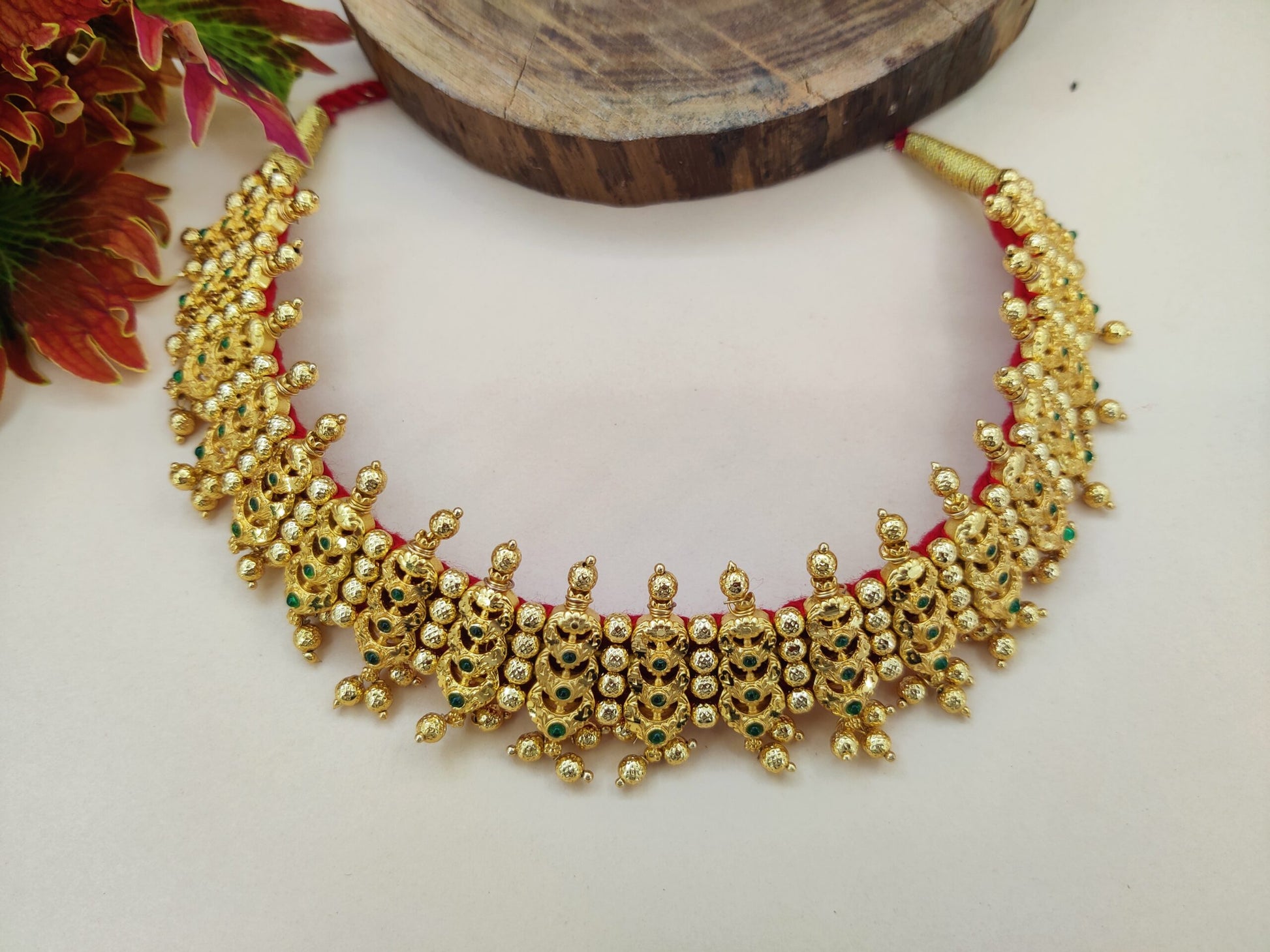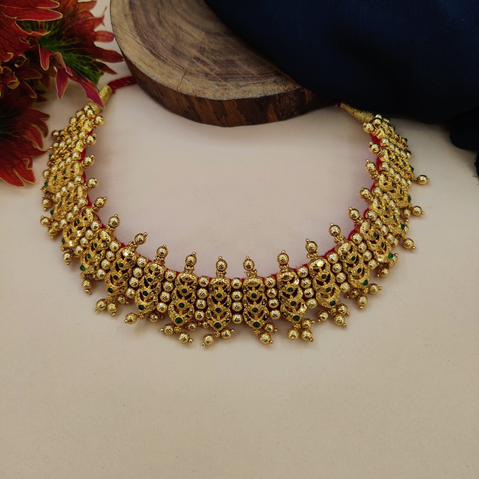 Veni Kolhapuri Thushi A delicately crafted Kolhapuri Thushi featuring fine beadwork and traditional artistry. Its elegant design adds a subtle, timeless charm, perfect for festive and ethnic occasions.