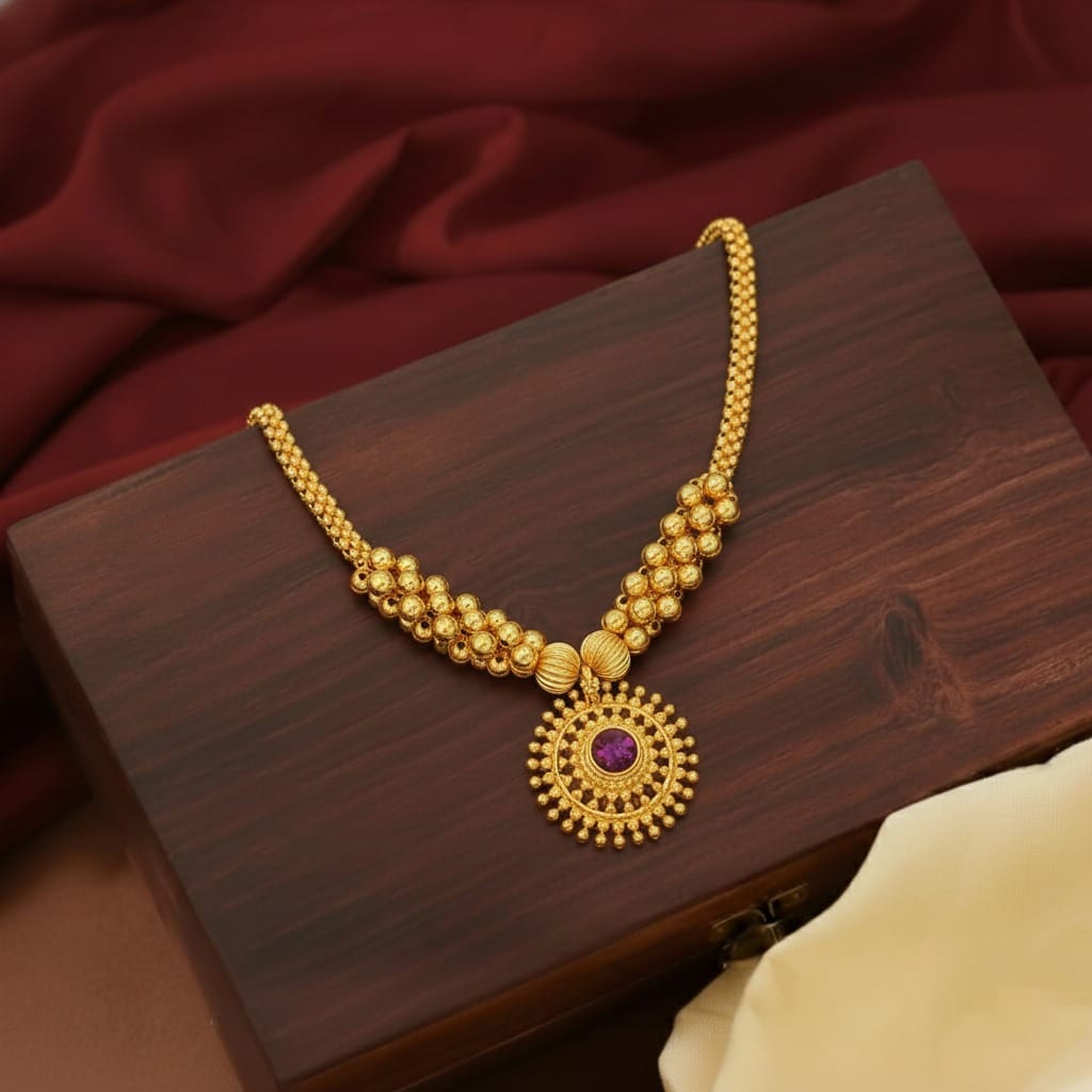 A stunning Kolhapuri Thushi crafted with fine traditional beads, designed to reflect a soft, radiant shine. Its close-fitting pattern blends elegance with heritage, making it a perfect choice for festive and cultural occasions.