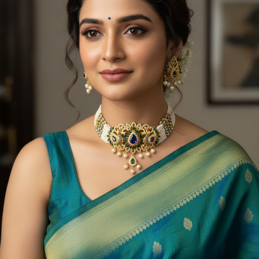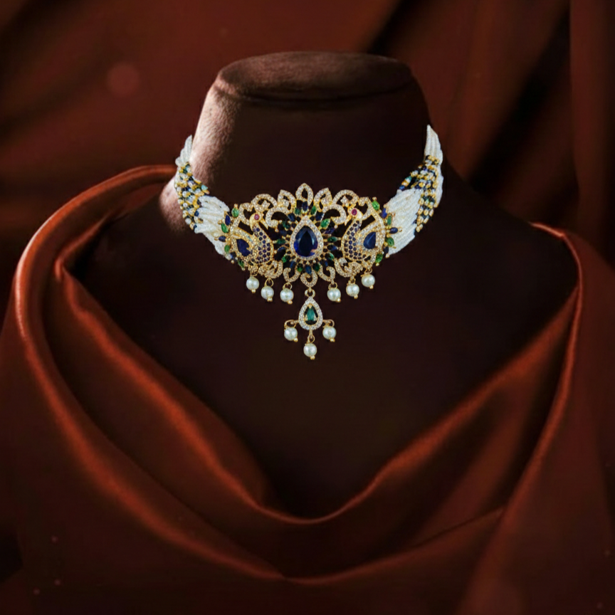 A majestic pearl necklace inspired by royal darbar elegance. Designed with layered moti strands for a grand traditional look. Perfect for weddings, festive occasions and bridal attire. Comfortable lightweight feel with a luxurious presence. Creates a bold regal statement with timeless charm. ✨
