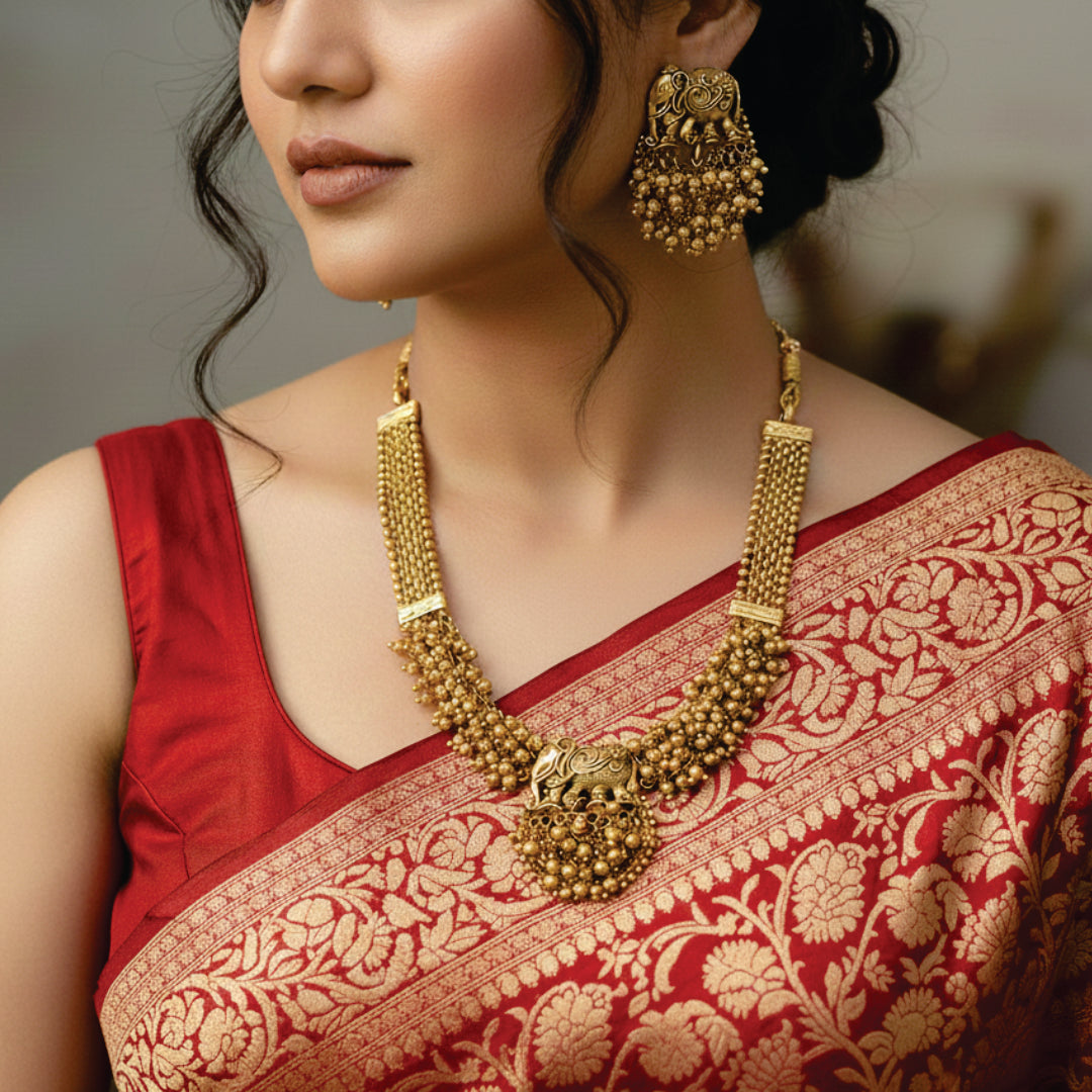 A beautifully crafted short necklace featuring an antique gold finish, intricate traditional motifs, and delicate detailing. Designed to sit close to the neckline, it adds a timeless elegance to ethnic attire, making it perfect for weddings, festivals, and special occasions.
