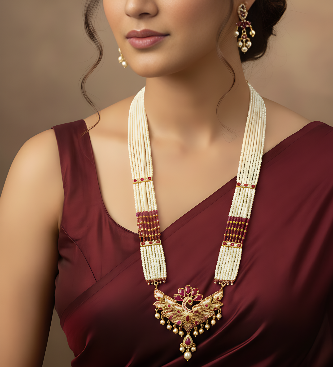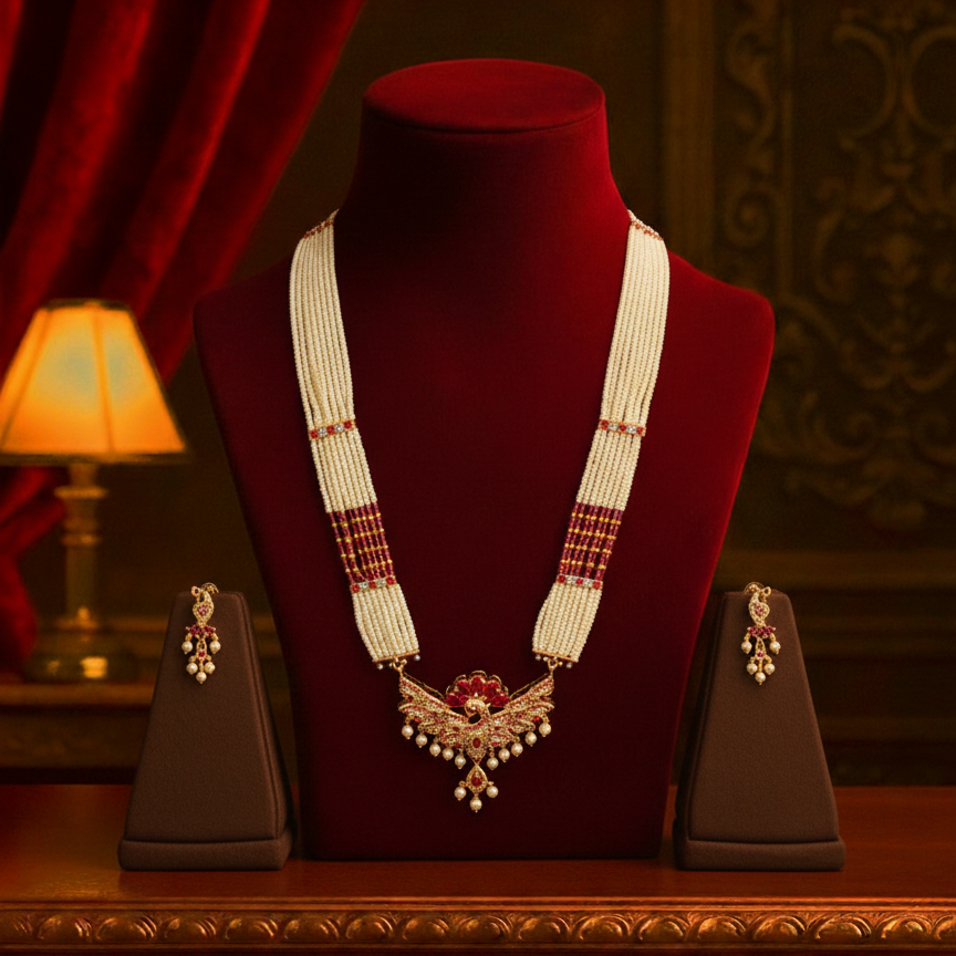A moon-inspired pearl necklace glowing with golden elegance. Adorned with radiant moti and subtle royal detailing. Perfect for weddings, festive occasions and silk saree looks. Lightweight comfort with a rich traditional appeal. Adds a soft luminous charm and timeless grace. ✨