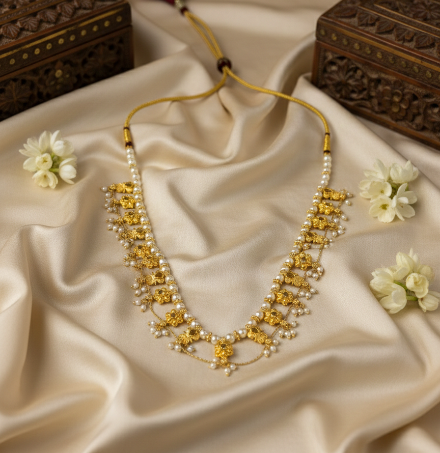 Swarnrekha Kolhapuri Saaj is a radiant expression of traditional Maharashtrian heritage. Designed with fine Kolhapuri detailing and elegant gold-finish elements, it exudes royal grace. Its beautifully aligned pendants create a striking and balanced look. Ideal for weddings, festive occasions, and cultural celebrations. A timeless masterpiece that adds charm, elegance, and grandeur to every ensemble.