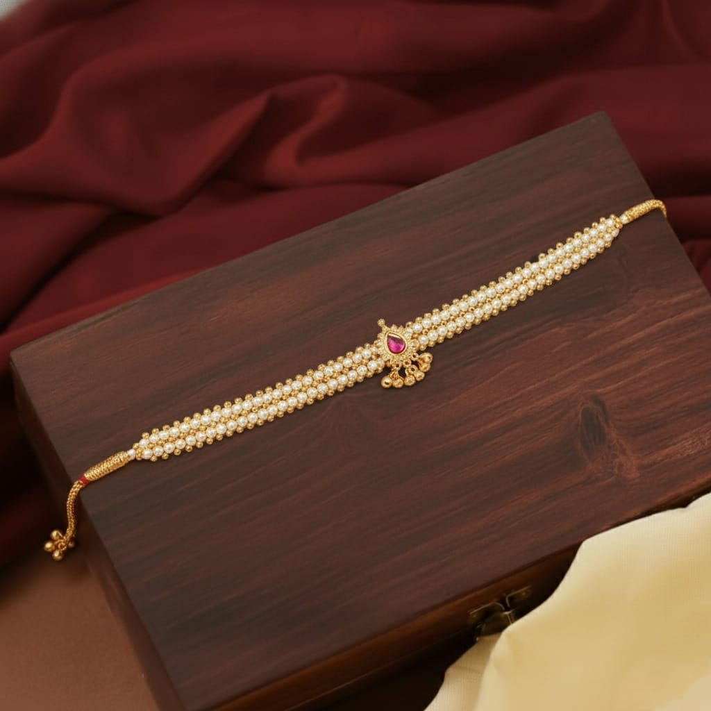 A beautifully handcrafted Kolhapuri Thushi made with delicate vajramoti beads. Its tightly woven design sits gracefully on the neck, adding a touch of traditional charm and a regal glow to any festive or ethnic look.